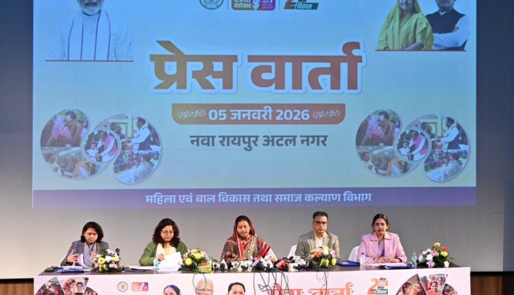 रायपुर: महिला एवं बाल विकास मंत्री श्रीमती लक्ष्मी राजवाड़े ने आज संवाद के ऑडिटोरियम में आयोजित प्रेस वार्ता में पत्रकारों से चर्चा करते हुए कहा कि विगत दो वर्षों में छत्तीसगढ़ शासन ने महिला एवं बाल विकास विभाग के माध्यम से महिलाओं, बच्चों और कमजोर वर्गों के जीवन में सकारात्मक और ठोस बदलाव लाने के लिए ऐतिहासिक पहल की है। इन योजनाओं का उद्देश्य महिलाओं को सम्मान, स्वास्थ्य, सुरक्षा और आत्मनिर्भरता प्रदान करना है।
