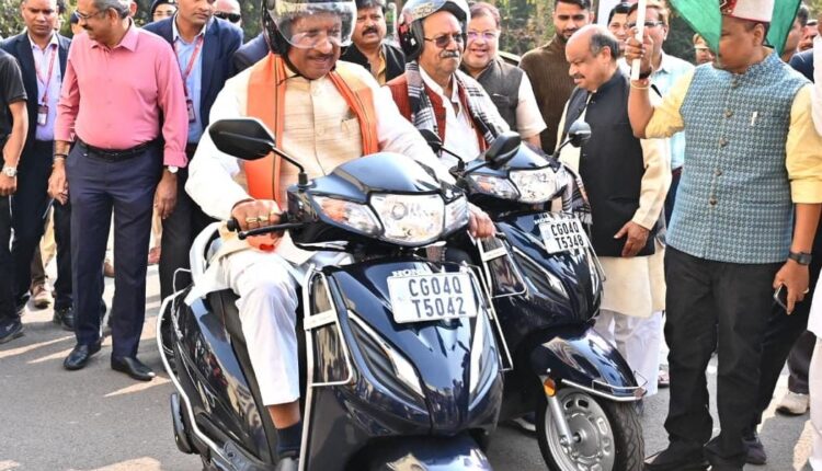 मुख्यमंत्री श्री साय ने सड़क सुरक्षा का संदेश देते हुए स्वयं हेलमेट पहनकर बाइक चालकों के दल के साथ स्कूटी चलाई।कार्यक्रम में मुख्यमंत्री श्री साय ने राजधानी रायपुर के पंडरी में आधुनिक लाइसेंस सेंटर कार्यालय भवन पंडरी का भूमिपूजन और प्रदेश भर में मुख्यमंत्री ग्रामीण बस योजना के तहत 12 नवीन मार्गों में 12 नवीन बसों का शुभारंभ किया।