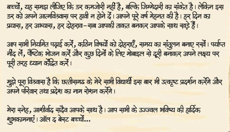 उन्होंने विश्वास व्यक्त किया कि छत्तीसगढ़ के सभी विद्यार्थी इस बार भी उत्कृष्ट प्रदर्शन करेंगे और अपने परिवार तथा प्रदेश का नाम रोशन करेंगे।