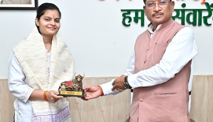 रायपुर: संघ लोक सेवा आयोग की सिविल सेवा परीक्षा में 35वीं रैंक प्राप्त करने वाली सुश्री वैभवी अग्रवाल ने आज मुख्यमंत्री श्री विष्णु देव साय से राजधानी रायपुर स्थित मुख्यमंत्री निवास कार्यालय में भेंट की। मुख्यमंत्री श्री साय ने सुश्री वैभवी को मिठाई खिलाकर उनकी इस उल्लेखनीय उपलब्धि पर हार्दिक बधाई और शुभकामनाएँ दीं।