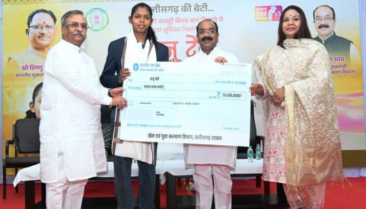 भारत को कबड्डी विश्वकप और एशियन चैंपियन बनाने वाली संजू देवी को 50 लाख की प्रोत्साहन राशि, उप मुख्यमंत्री अरुण साव ने सौंपा चेक, राज्य में पहली बार किसी खिलाड़ी को दी गई है इतनी बड़ी प्रोत्साहन राशि…..