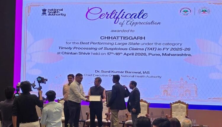 रायपुर: भारत सरकार के राष्ट्रीय स्वास्थ्य प्राधिकरण द्वारा दिनांक 17 एवं 18 अप्रैल 2026 को पुणे (महाराष्ट्र) में आयोजित चिंतन शिविर में देश के सभी राज्यों को योजना के बेहतर क्रियान्वयन हेतु आमंत्रित किया गया। इस अवसर पर छत्तीसगढ़ राज्य को योजना के प्रभावी संचालन, सुदृढ़ प्रशासनिक व्यवस्था तथा पारदर्शी क्लेम प्रबंधन प्रणाली के उत्कृष्ट प्रदर्शन के लिए राष्ट्रीय स्तर पर दो प्रतिष्ठित पुरस्कारों से सम्मानित किया गया।